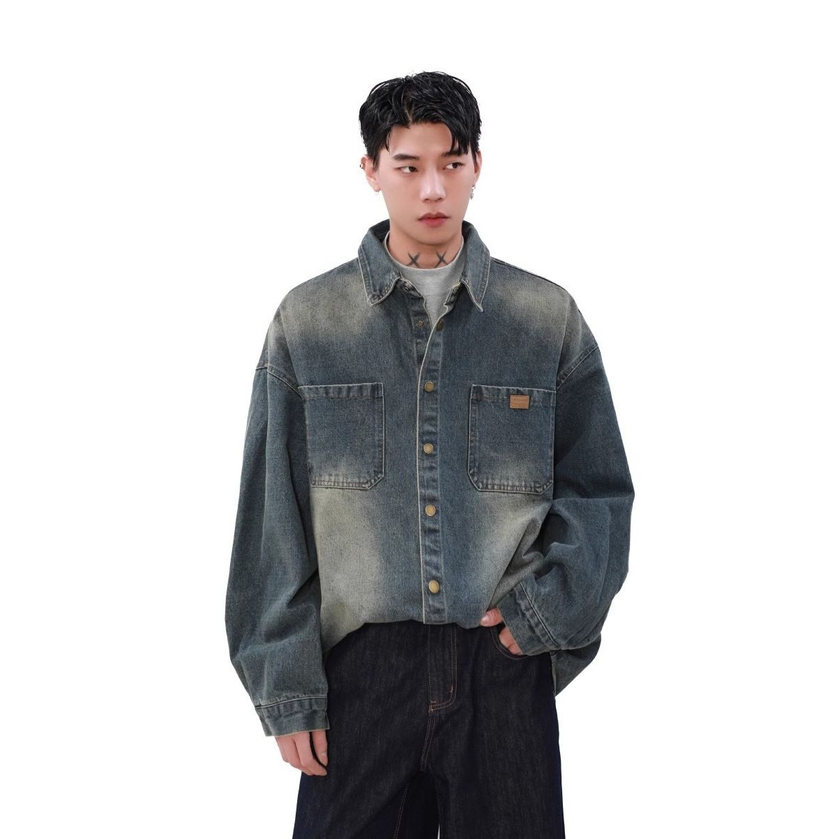 美式复古做旧泛黄牛仔衬衫男长袖春秋季新款宽松痞帅衬衣外套上衣