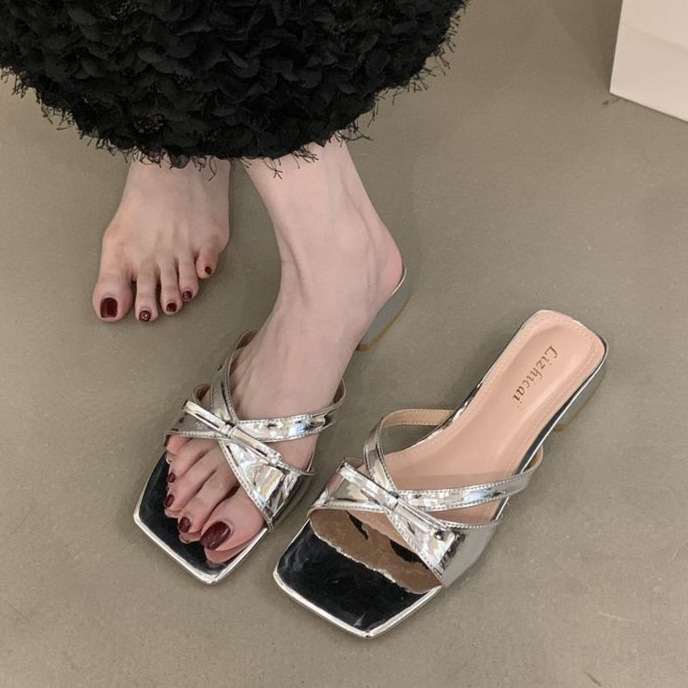 2025春新款女鞋黑色蝴蝶结饰高跟凉鞋细跟一字带外穿凉拖鞋穆勒鞋