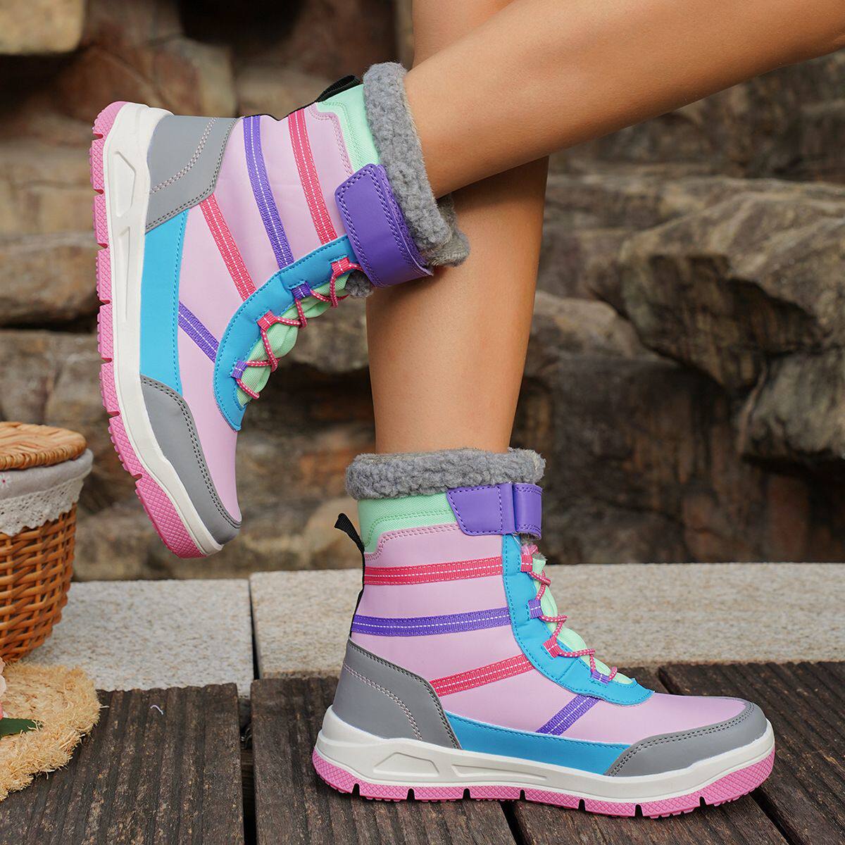 冬季新款中大童雪地靴运动潮流风拼色雪地靴防滑保暖