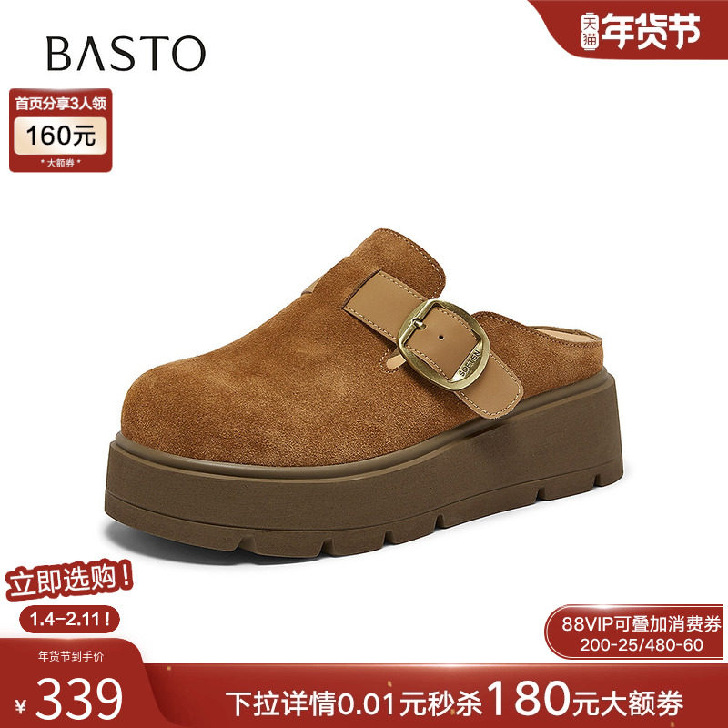 百思图2026夏季新款真皮厚底勃肯鞋休闲外穿包头女半拖鞋D5005BH6