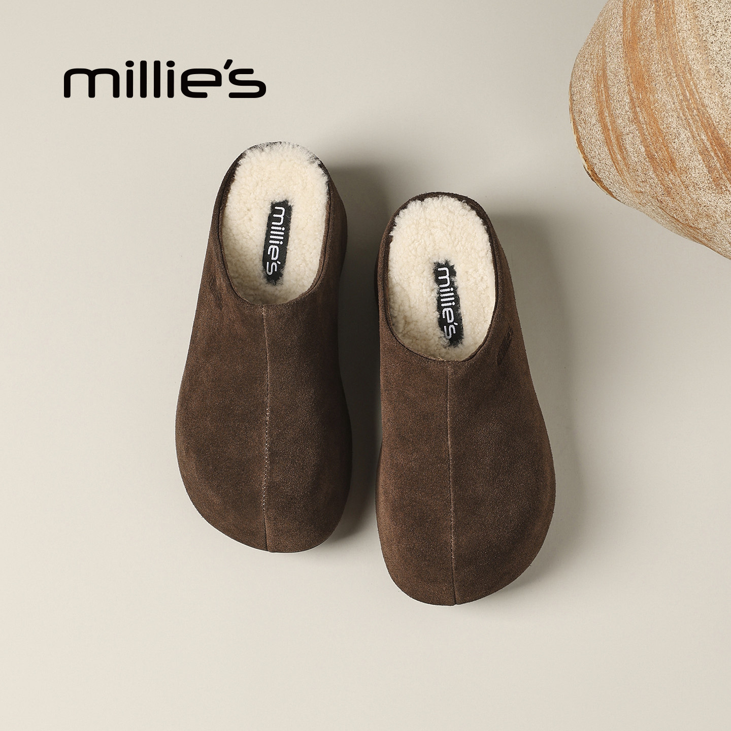 MILLIE'S/妙丽反绒皮勃肯鞋女加绒包头半拖鞋懒人鞋内增高一脚蹬Z