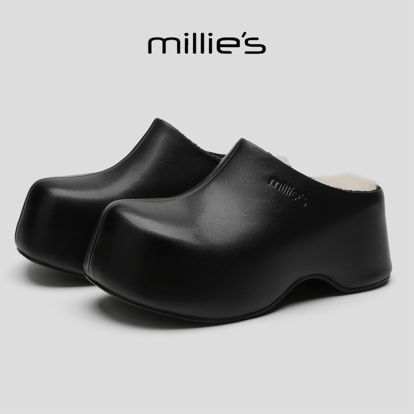 MILLIE'S/妙丽2025冬季新款户外皮面半包拖鞋加绒保暖厚底不累脚