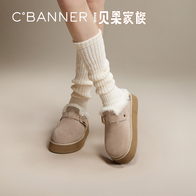 千百度贝果拖鞋时尚雪地靴女冬季勃肯鞋毛毛鞋厚底加绒保暖包头拖