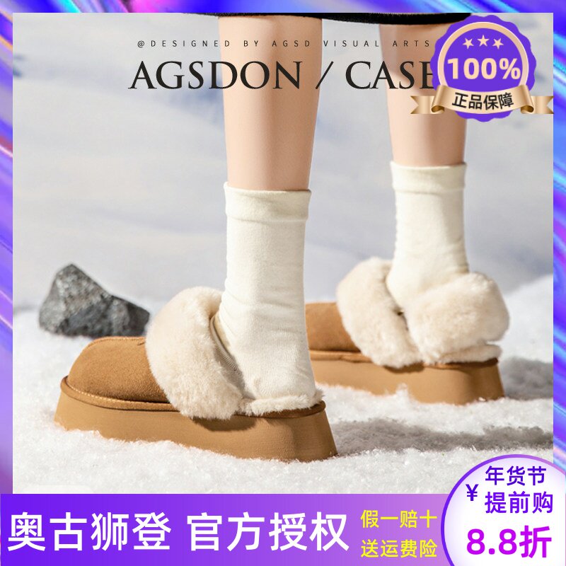 奥古狮登雪地靴棉鞋女25冬季新款厚底牛皮加绒保暖外穿毛毛半拖鞋