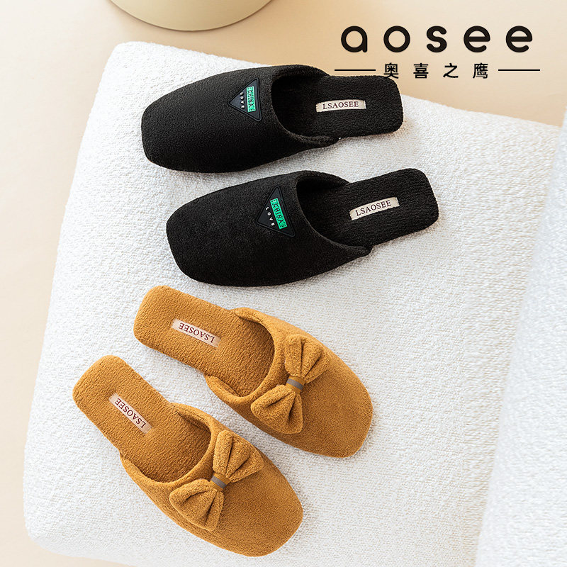 新款蝴蝶结棉拖鞋女秋冬室内牛筋底防滑静音情侣轻奢优雅毛毛拖鞋
