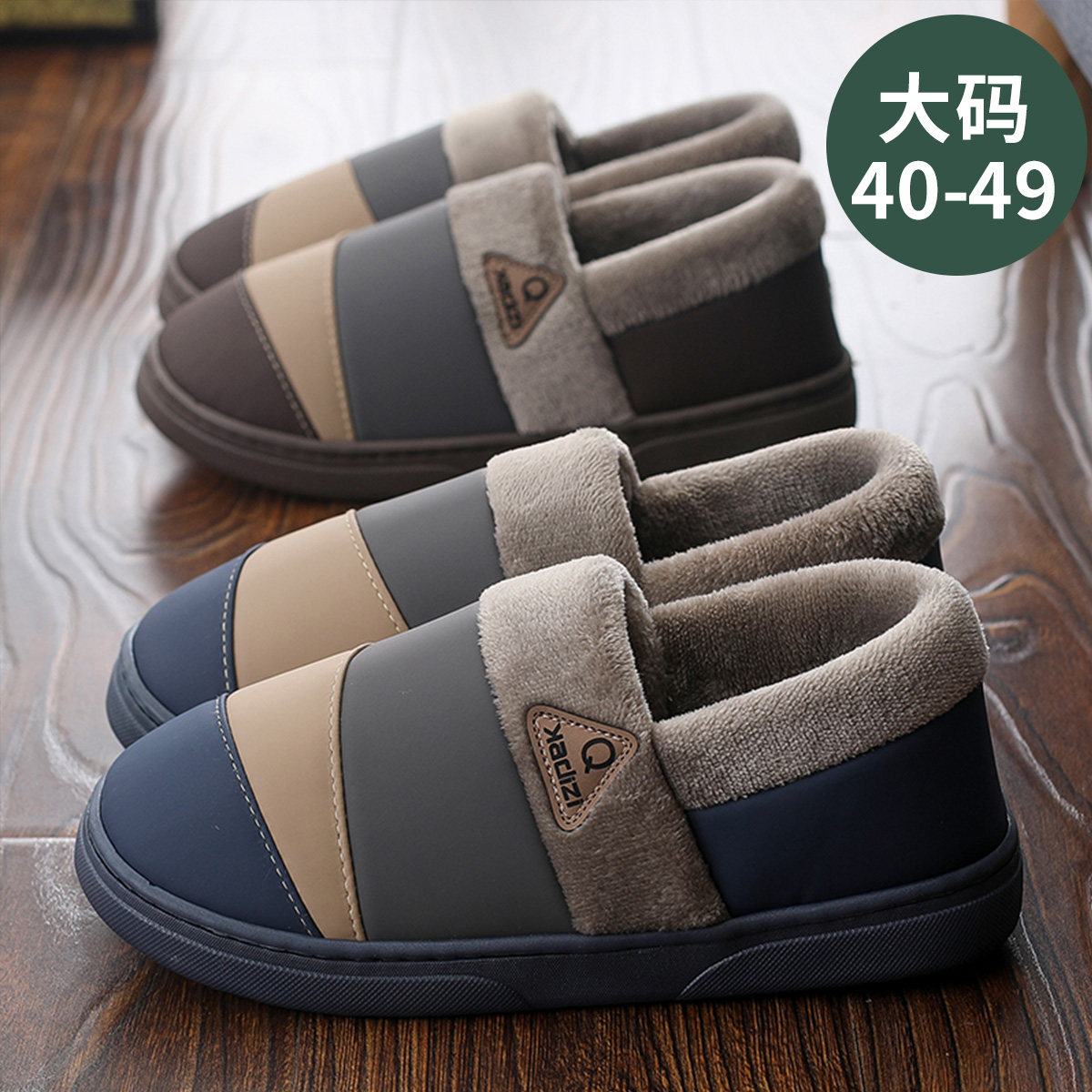 男士棉拖鞋大码秋k冬包跟加绒加厚保暖家居室内防水Pu棉鞋男冬外