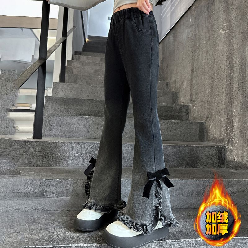 儿童一体加绒裤初中生秋冬新款女童喇叭裤子绒大童牛仔裤女孩