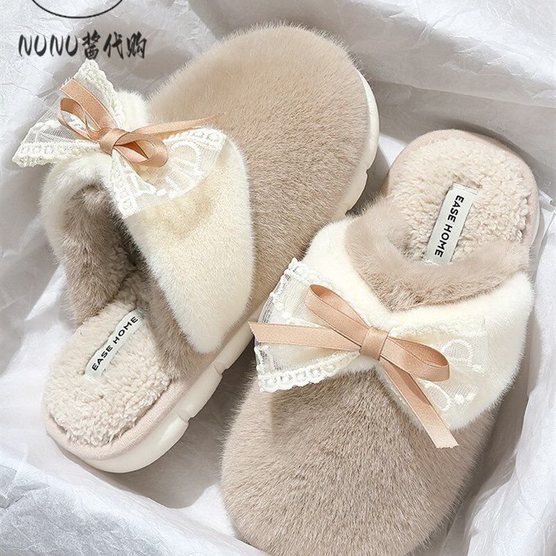 速发蝴蝶结棉拖鞋士秋冬季室内家滑202保防暖居毛毛绒月子棉鞋