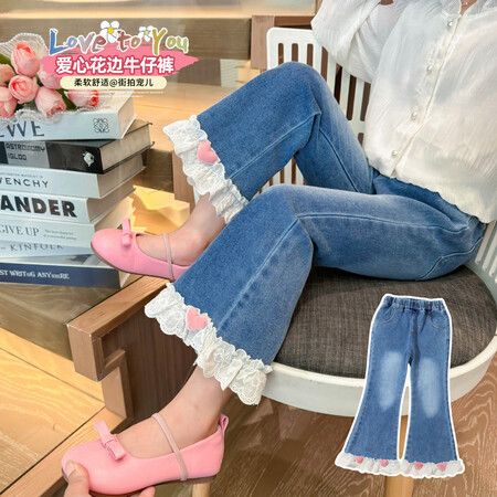 女童爱心花边牛仔喇叭裤春秋新款洋气儿童弹力百搭女宝宝裤子