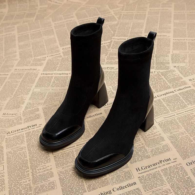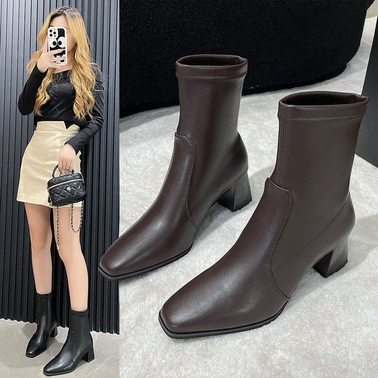 小方头短靴女秋冬新款时尚高跟瘦瘦靴子粗跟高级感弹力马丁靴