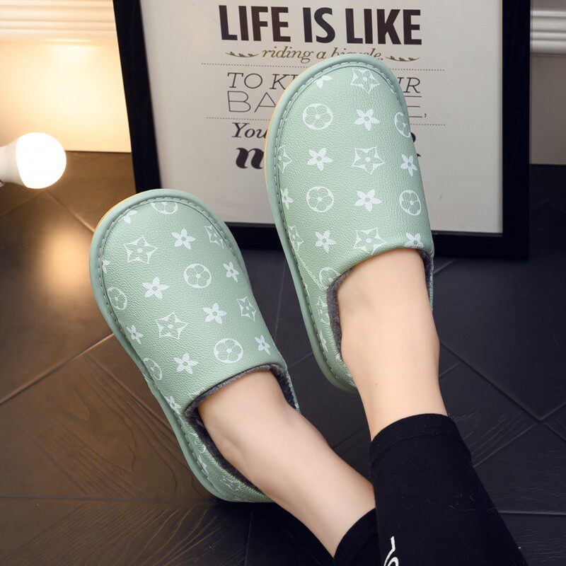 防水皮面包跟月子保暖棉拖鞋厚底家居H防滑男女情侣棉鞋秋冬季外