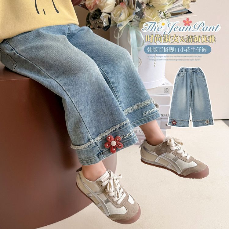 女童春秋直筒牛仔裤儿童刺绣韩版休闲裤子女孩百搭秋装阔腿长裤子
