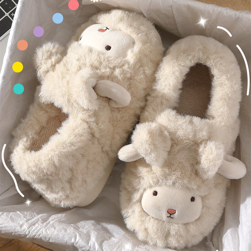 新品棉拖鞋女士秋冬季防滑厚底包跟室内家居加绒毛V毛保暖可爱月