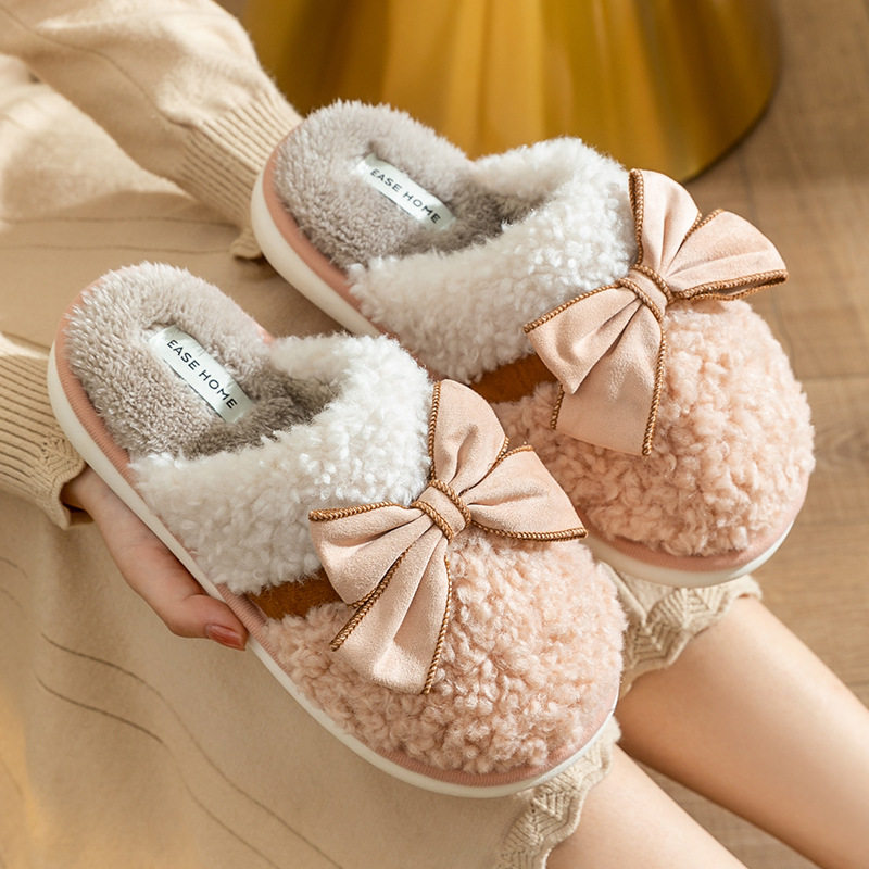 极速2022新款 情侣韩式复古蝴蝶结棉拖鞋女冬保R暖毛绒绒居家鞋男