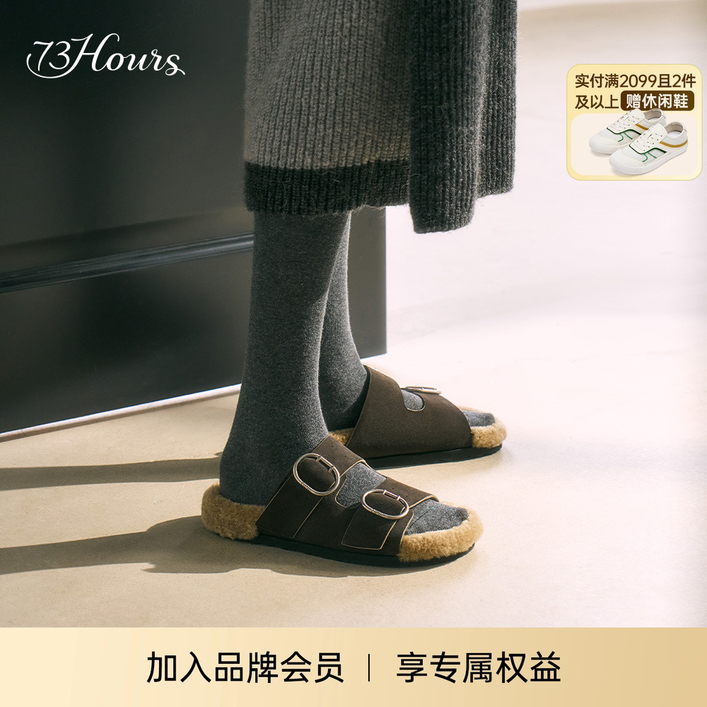 73hours女鞋暖暖热巧春季新款一脚蹬外穿平底毛毛鞋女勃肯拖鞋