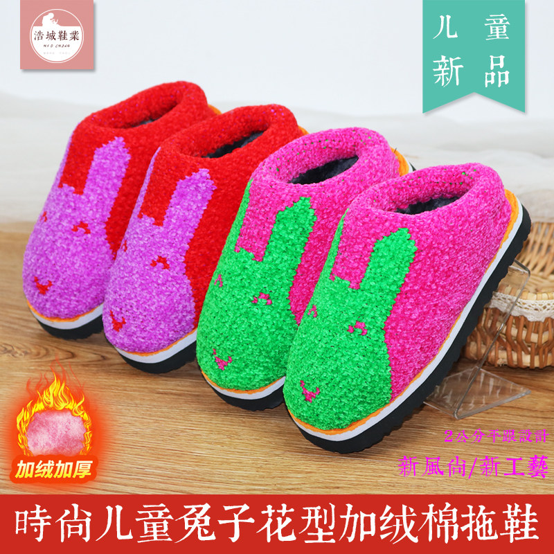 孺子牛鞋底儿童兔子花型加绒加厚手工毛线拖鞋冬季保暖亲子居家鞋