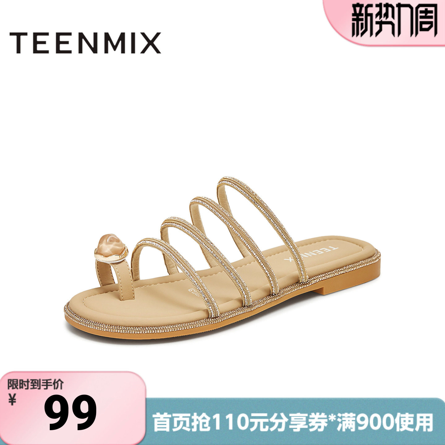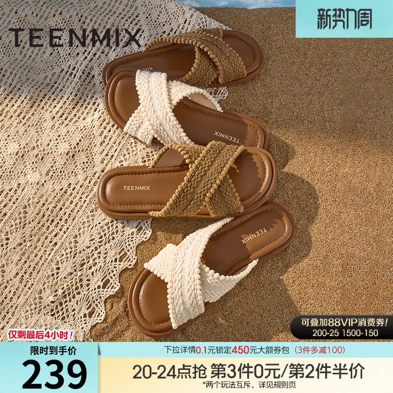 天美意一字拖编织度假平底拖鞋女外穿休闲凉鞋夏季新款KT072BT5