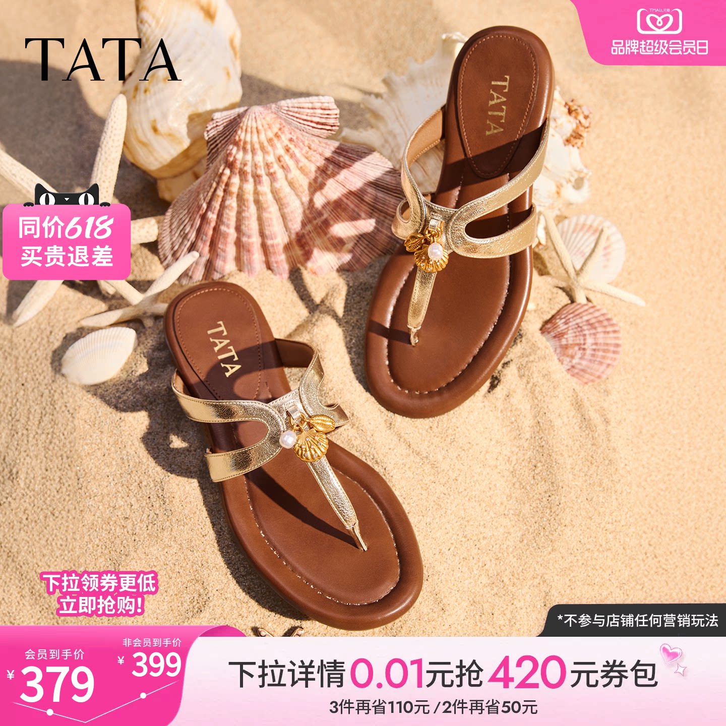 真皮~骄屿法式坡跟夹趾人字拖鞋女夏新款休闲外穿度假一字带凉拖
