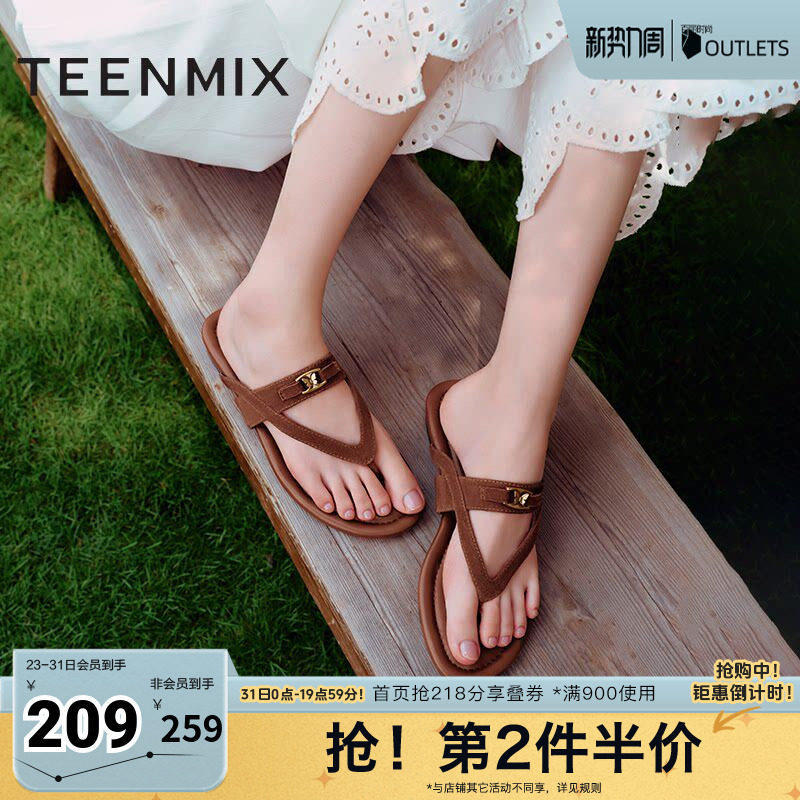 天美意新款复古百搭平底夹趾简约女一字带凉拖鞋KT094BT5