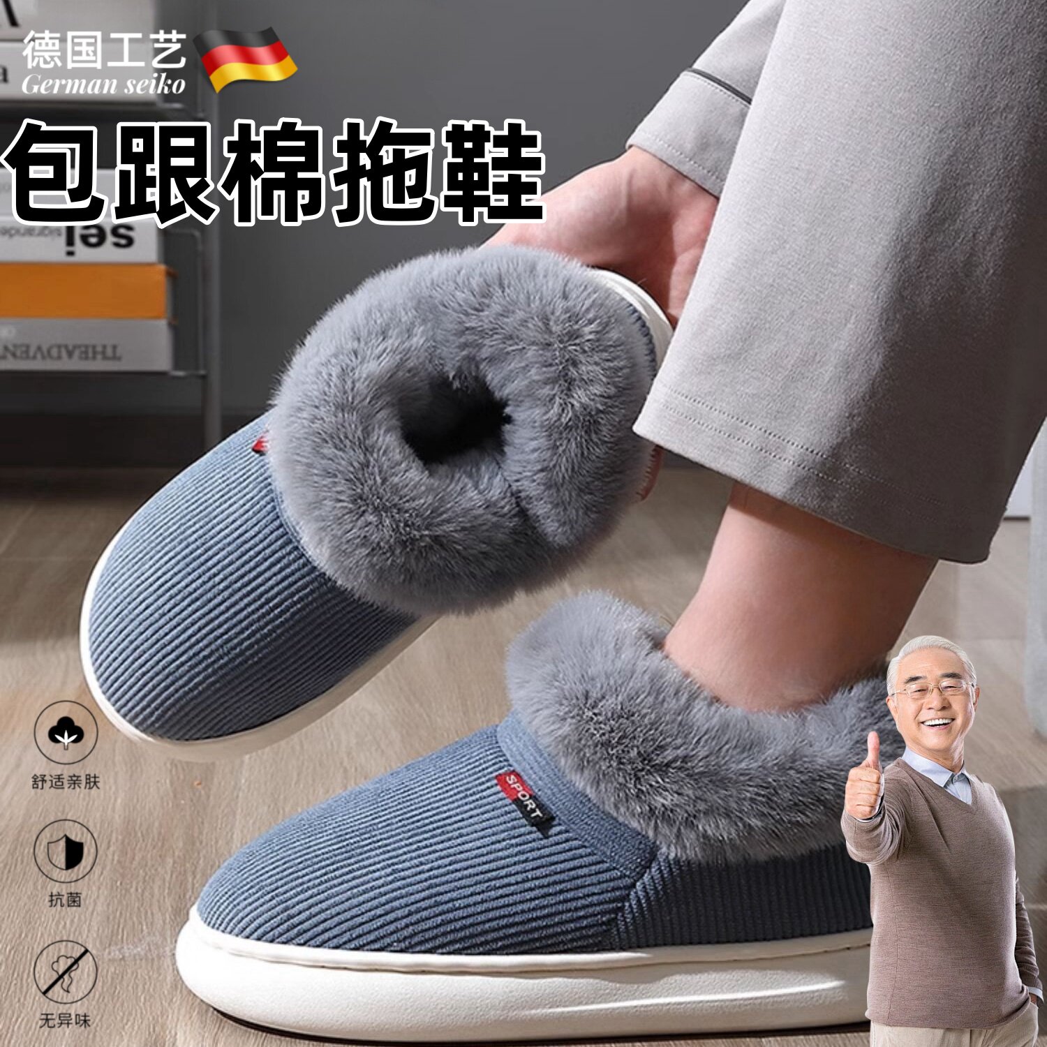 德国棉拖鞋男士冬季加绒加厚防滑防摔老人专用厚底高帮外穿不臭脚