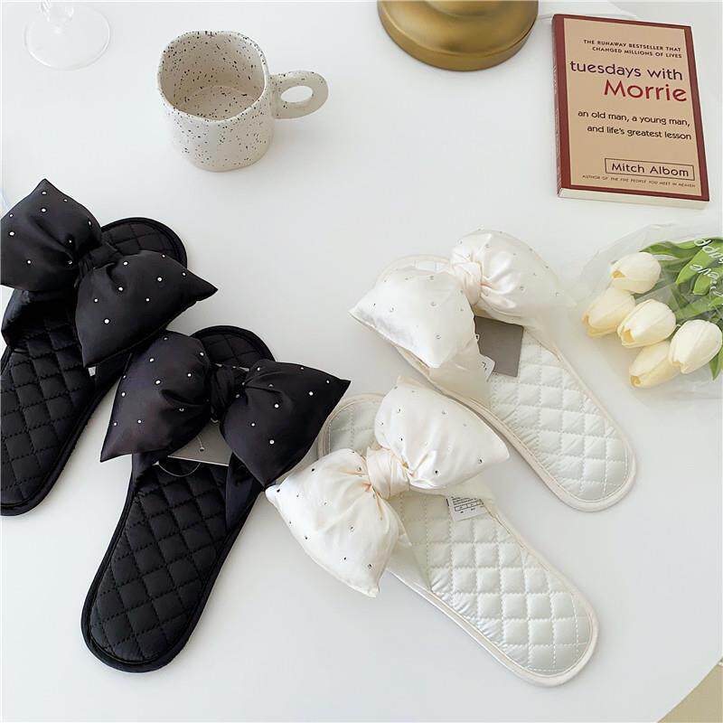 2022新款四季款蓬蓬蝴蝶结烫钻纯色室内家居拖鞋女甜美平底鞋防滑