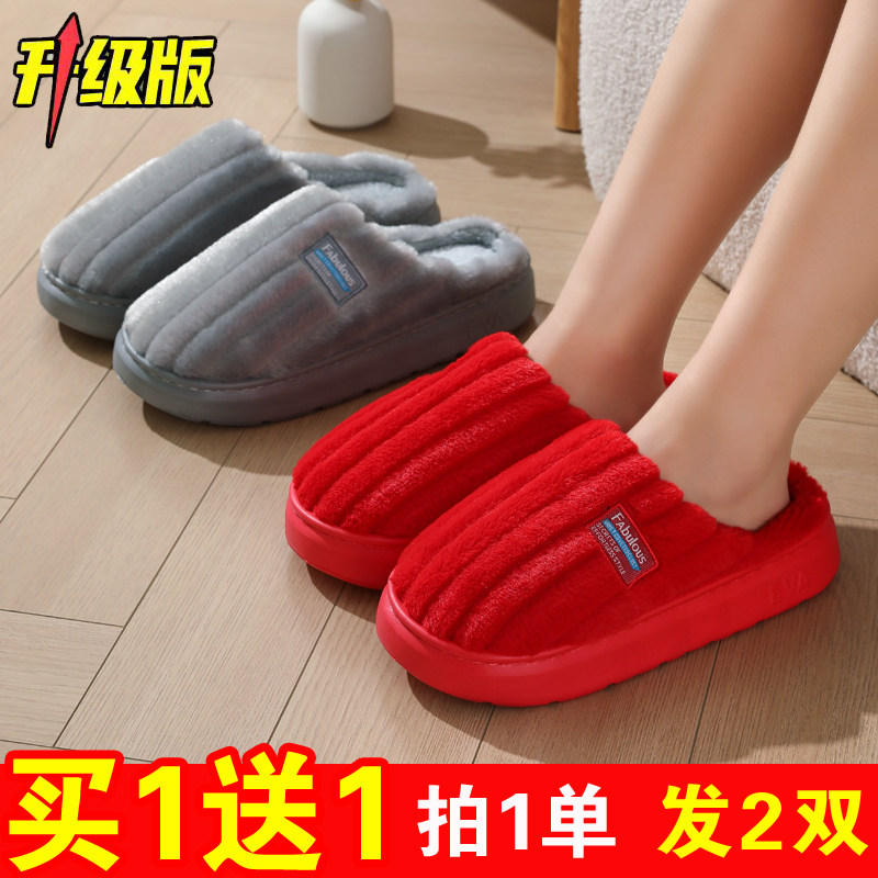 买1送1棉拖鞋女士冬季情侣居家室内防滑冬天保暖红色婚庆毛拖鞋男