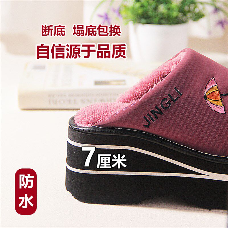 高跟棉拖鞋女冬季无跟厚底外穿防水保暖增高防滑皮面手工泡沫底拖