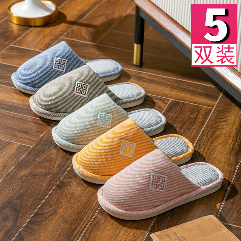 5双装 棉拖鞋用待客人家用秋冬季不加绒K厚底防滑男女冬天室内居
