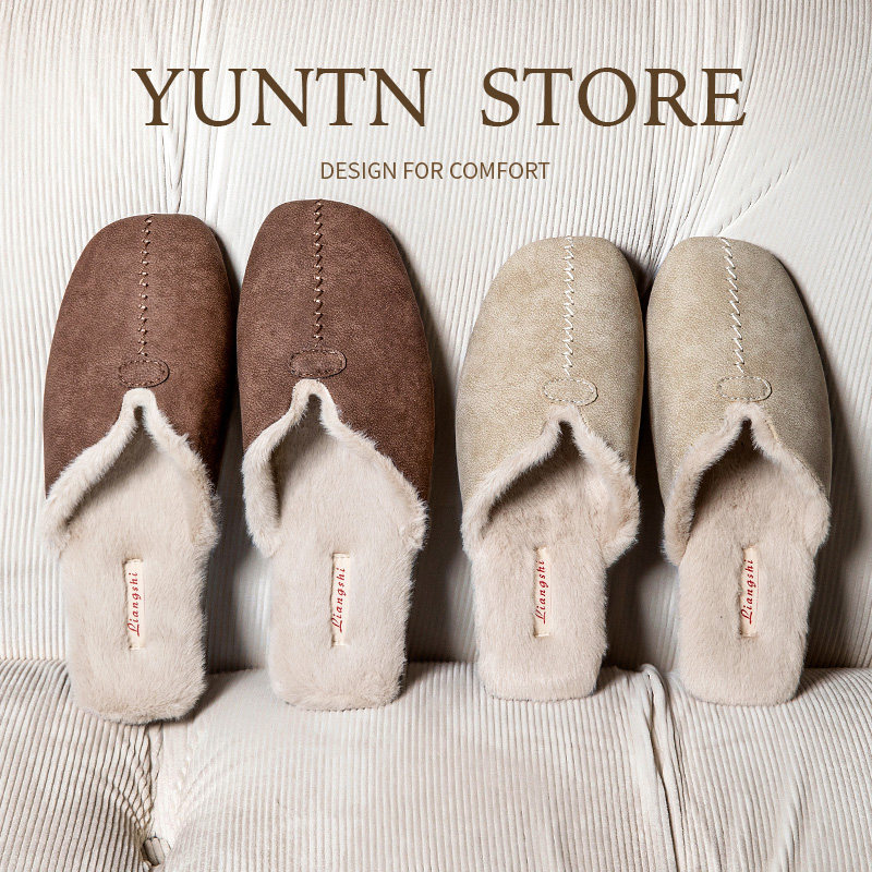 秋冬羊巴皮高级感情侣PU皮防水棉拖鞋女室内防滑牛筋底男轻便轻声