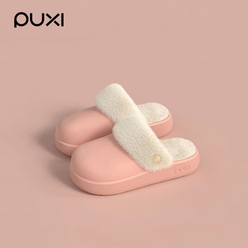 朴西栖梧情侣加绒棉拖鞋女士秋冬家用室内保暖防滑防泼水皮面新款 桃沙粉 37-38