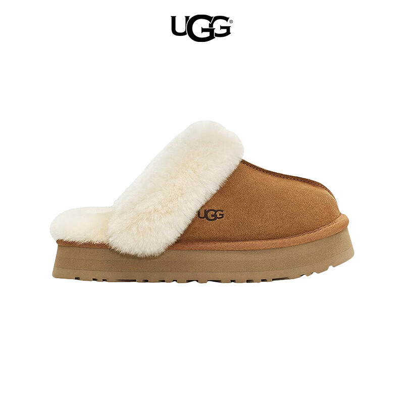 UGG毛绒拖鞋秋冬户外百搭保暖拖鞋厚底増高休闲女士鞋栗色1122550CHE