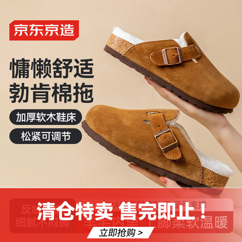 京东京造软木包头勃肯鞋毛毛拖鞋加绒内里半包半拖休闲鞋 栗色 39