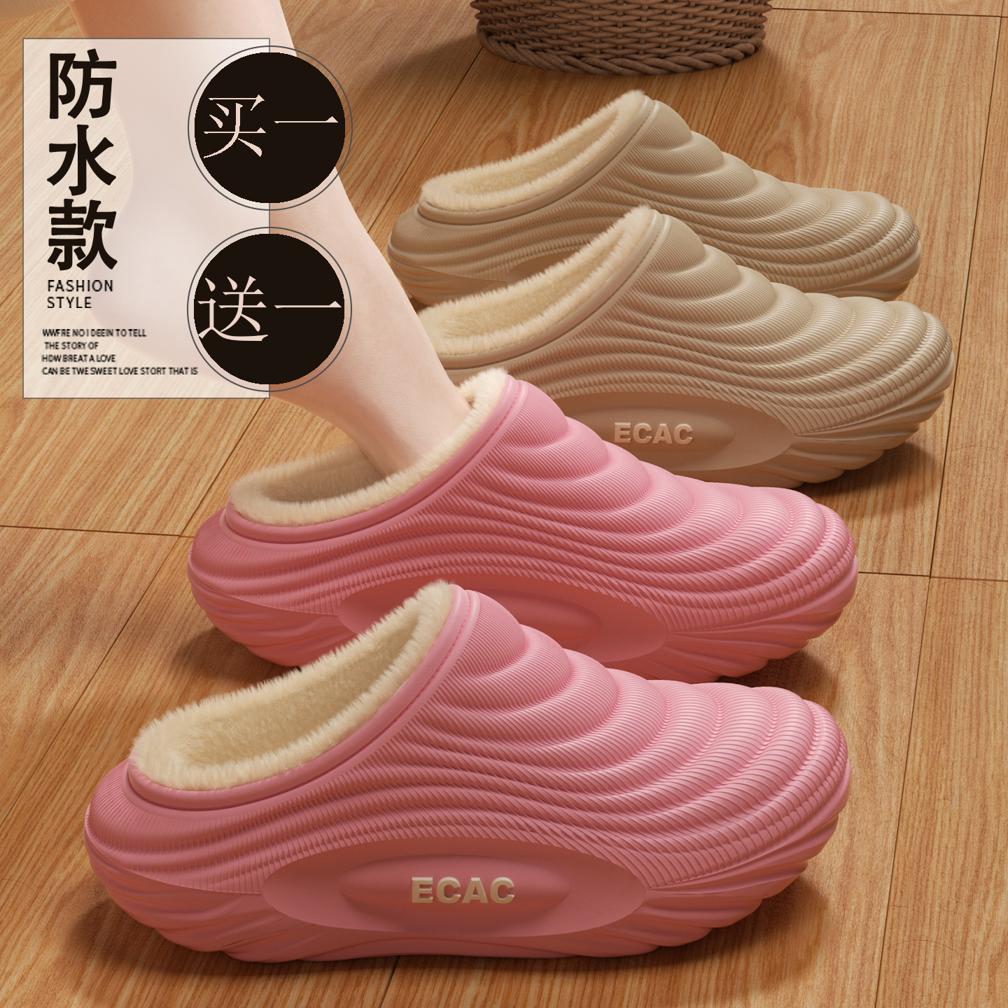 买一送一防水棉拖鞋女士冬2025新款室内家居厚底加绒保暖情侣棉拖