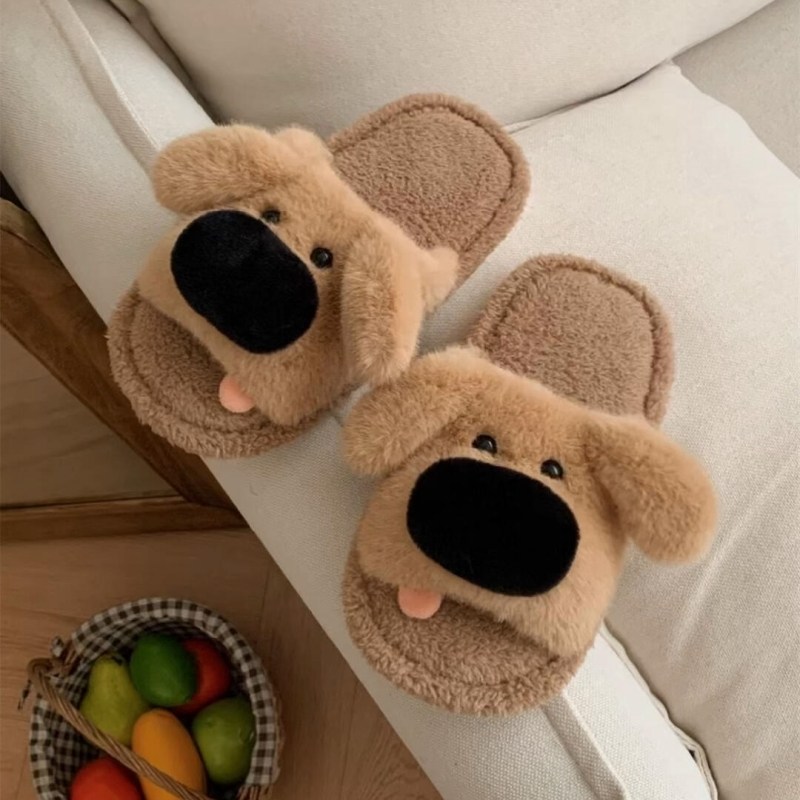 呆萌狗狗毛毛拖鞋新款露指情侣卡通男女休闲家居室内软底棉拖鞋