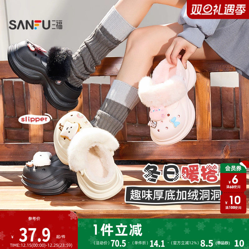 三福创意趣味洞洞鞋一字拖 温暖毛绒生活好物家居拖鞋849288