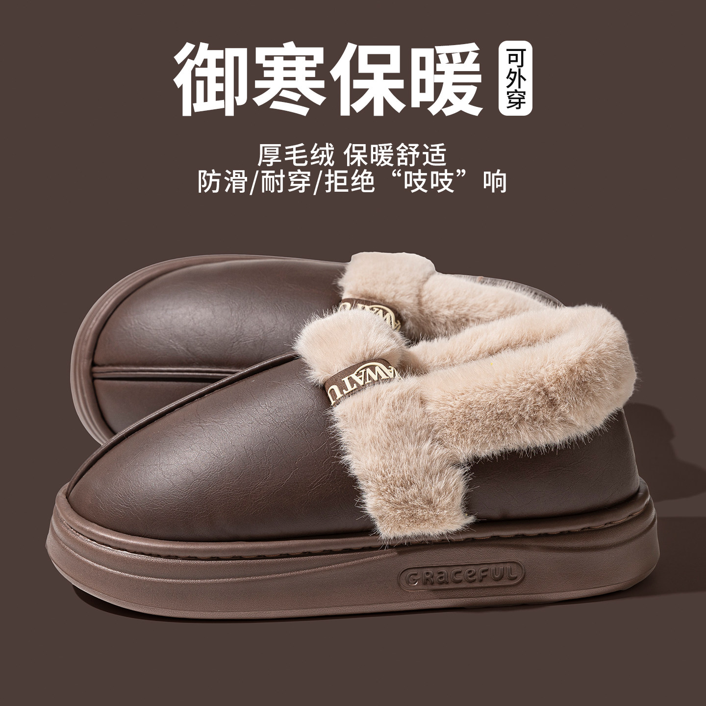 皮面防水包跟棉拖鞋男2025新款外穿防滑家居室内厚底毛绒保暖棉鞋