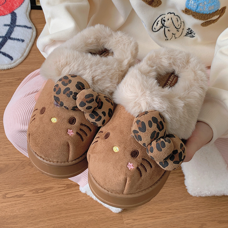 可爱新款辣妹豹纹kt猫拖鞋女外穿厚底室内家居防滑软底一字毛毛拖