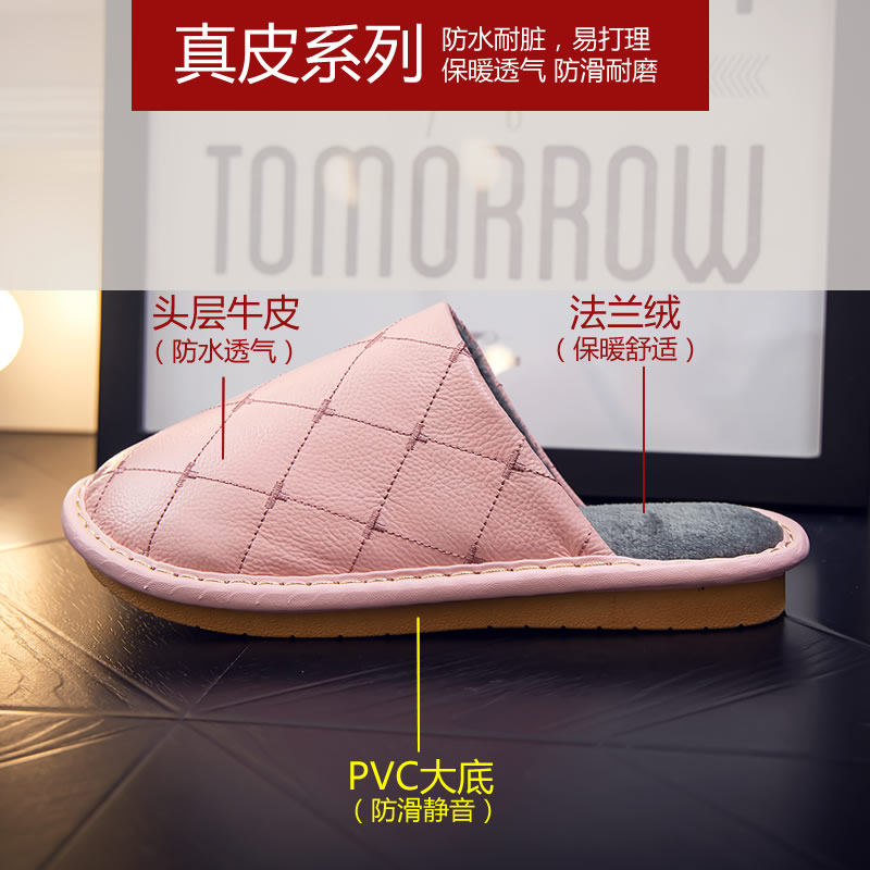 极速海宁全真皮居家棉拖鞋家居绣花冬季拖鞋女情侣防X滑厚底牛皮