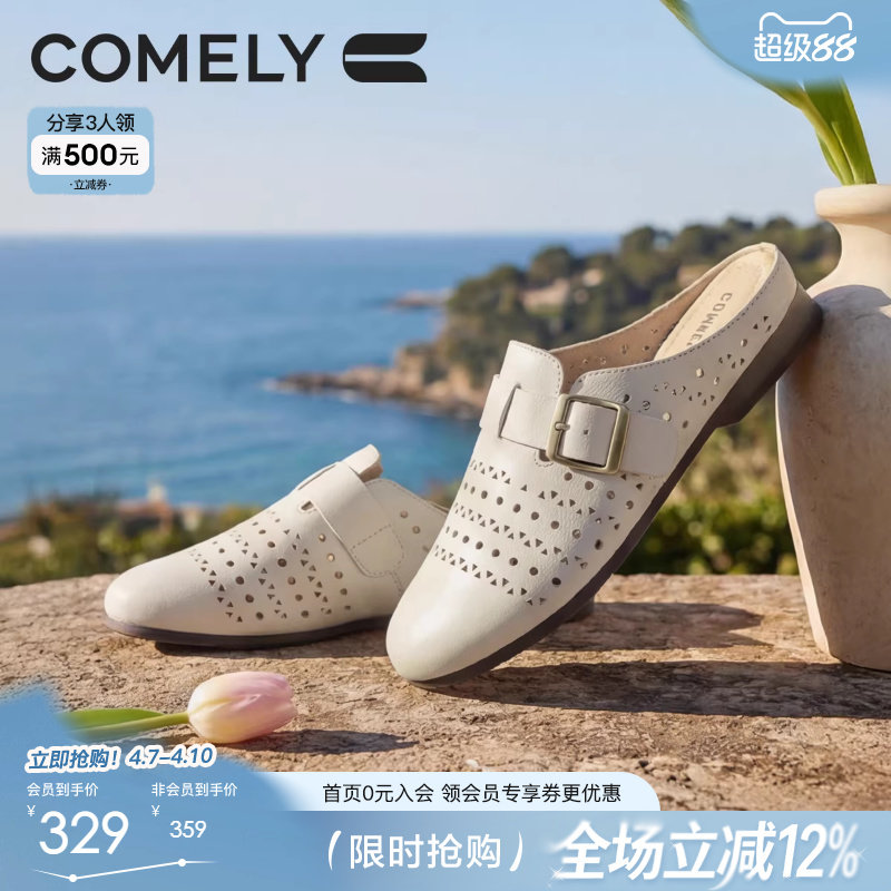 康莉透气镂空羊皮包头半拖鞋女夏季新款真皮软底外穿粗跟穆勒鞋子