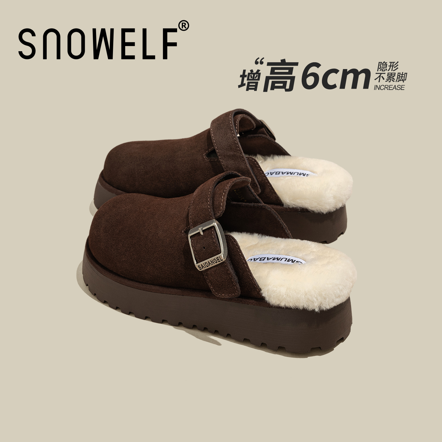 棕色真皮加绒勃肯鞋女2025新款秋冬外穿包头半拖鞋厚底一脚蹬女鞋