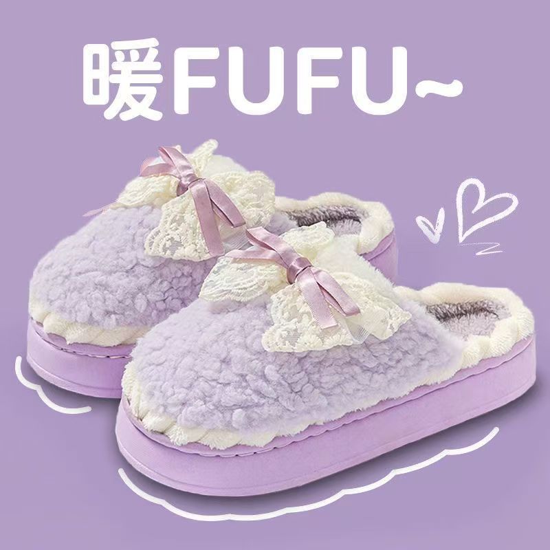 冬季新款棉拖鞋女蕾丝蝴蝶结保暖防滑可爱室内家居厚底毛毛绒棉拖