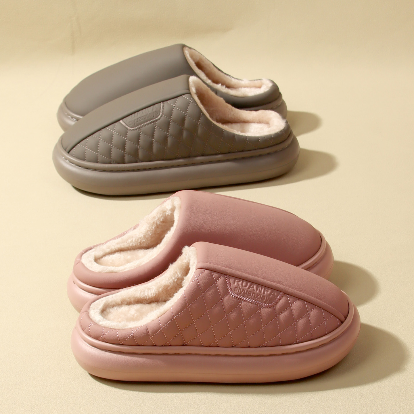 新款女士PU皮面防水棉拖鞋男孩家居家防滑保暖办公室毛绒拖鞋秋冬