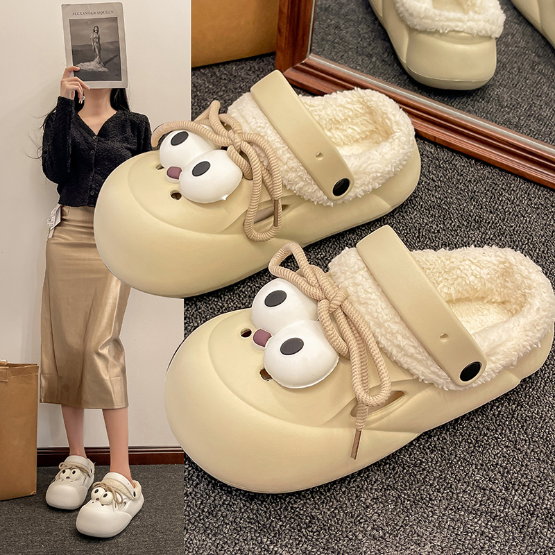 棉拖鞋女冬季踩屎感加绒保暖新款外穿居家可爱大眼睛防水包跟拖鞋