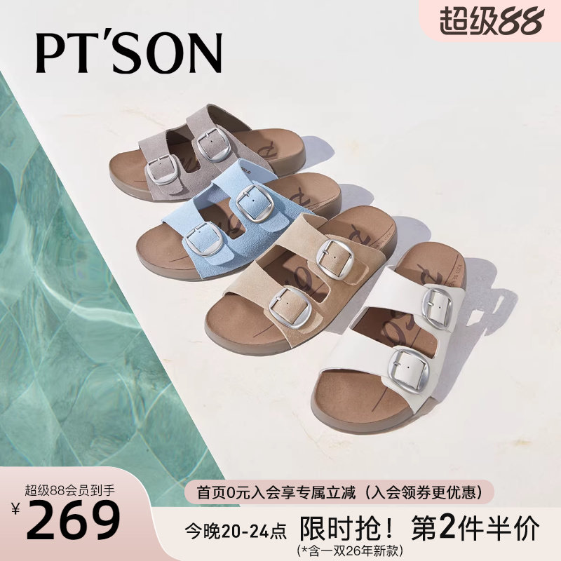 踩屎感~真皮二舅h拖鞋女夏外穿2026新款厚底魔术贴平底一字带凉拖