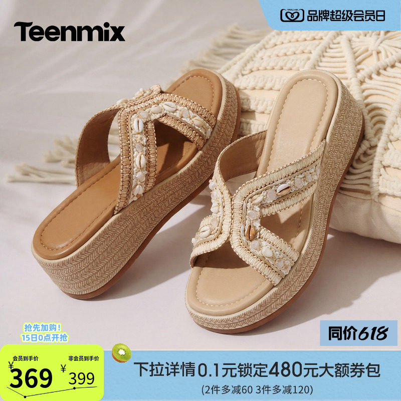 天美意一字拖波西米亚坡跟厚底拖鞋女编织海边度假凉拖2026夏新款
