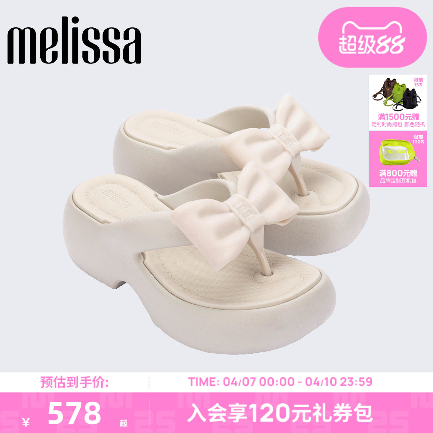 Melissa/梅丽莎26新品女多巴胺配色厚底蝴蝶酥面包人字拖鞋37622