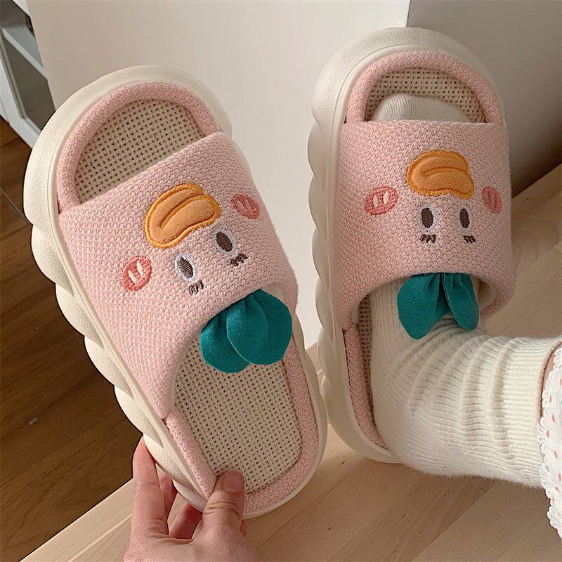 女春秋季可爱童趣少女心亚麻拖鞋学生四季居家软厚底月子棉麻凉拖
