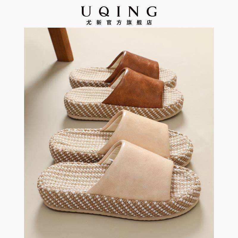尤新春夏上新吸汗防臭情侣木地板静音皮革亚麻凉拖鞋办公室四季通