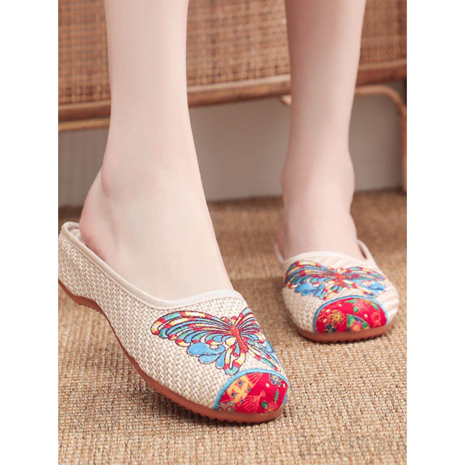 亚麻拖鞋老北京布鞋女士凉鞋民族风休闲百搭包头拖增高软底绣花鞋