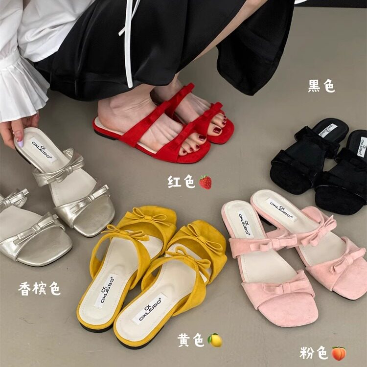 OK莱宝甜美蝴蝶结气质凉拖鞋方头公主仙女鞋配裙子平底凉鞋一字拖